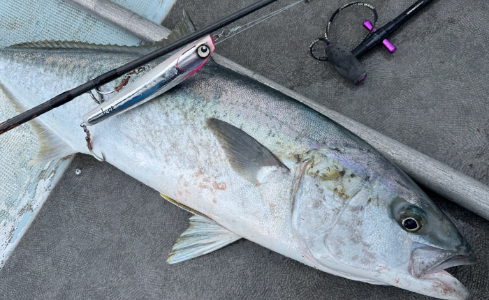 Wood Lureリップレスミノータイプに仕上げ、ポッピングでスプラッシュを上げた後に水に入り込んでからシッポを振るようなアクションを実現。短いロッドワークでアピールできるため、乗合船のような限られたスペースでの使用にも適している。